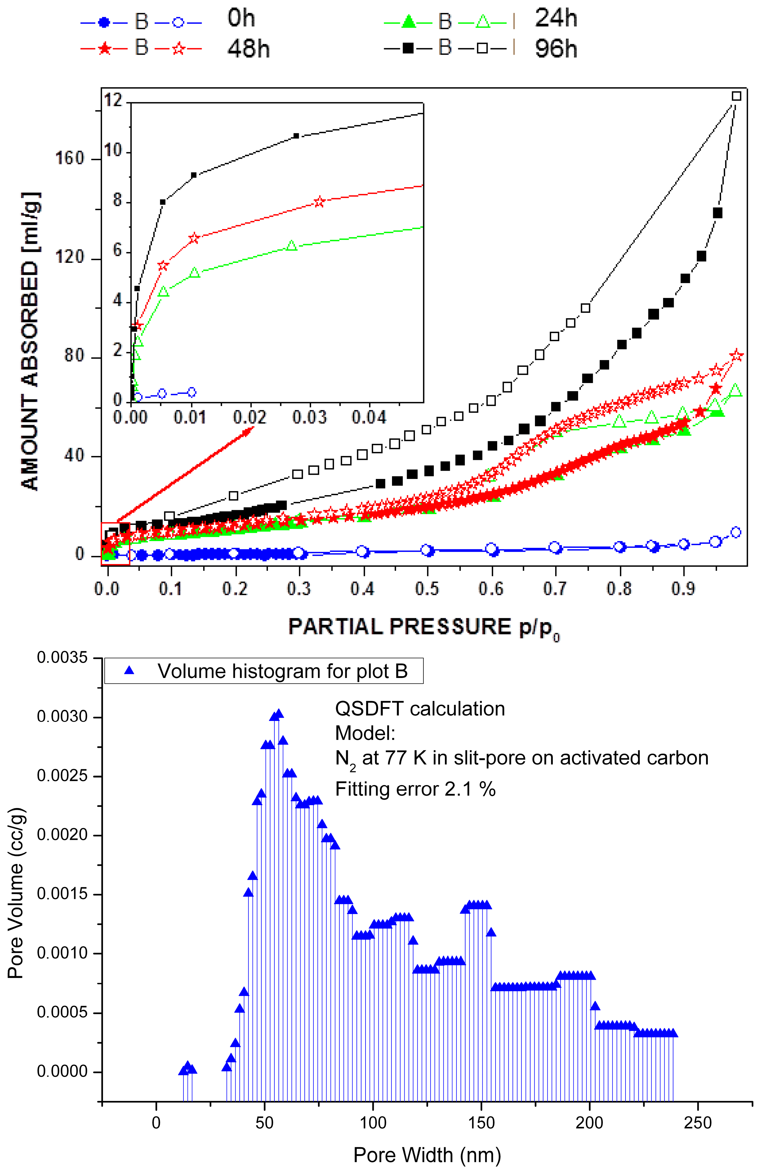 Adsorption isotherms (BET) for the adsorption (closed symbols) and desorption (open symbols) of N2 (77 K) on[Sm2Cl6(bipy)3]·2bipy (5) for an activation of the MOF at 300 °C and 10−6 mbar for activation times between 0–96 h; prolonged activation times result in formation of meso- and macropores indicated by growing hysteresis (top); determination of the pore distribution of the thermally treated framework 5 after 96 h using QSDFT calculation based on slit-pore model for activated carbon (bottom).