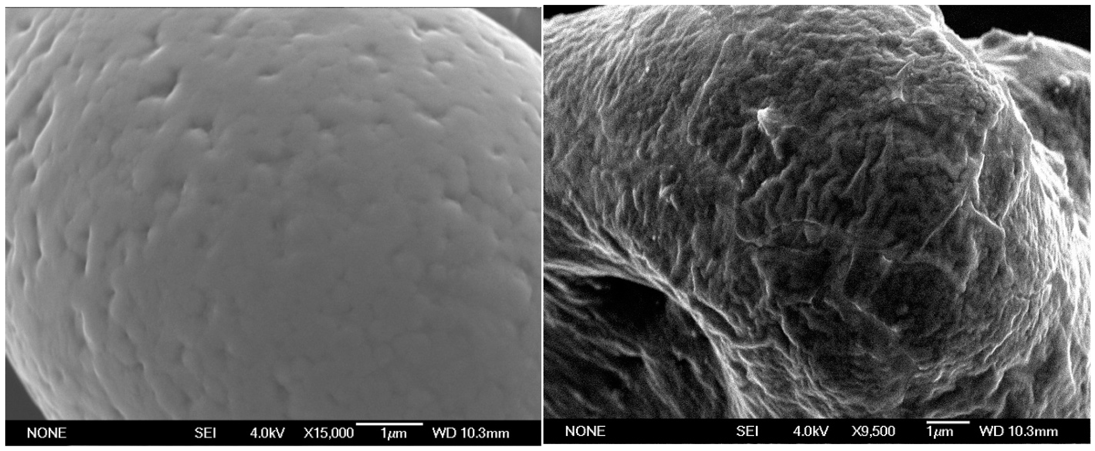 Electron microscopic images (SEM) of[Sm2Cl6(bipy)3]·2bipy (5) for an activation of the MOF at 300 °C at 10−6 mbar and an activation time of 24 h (left) and 96 h (right) indicating the ongoing surface modification.