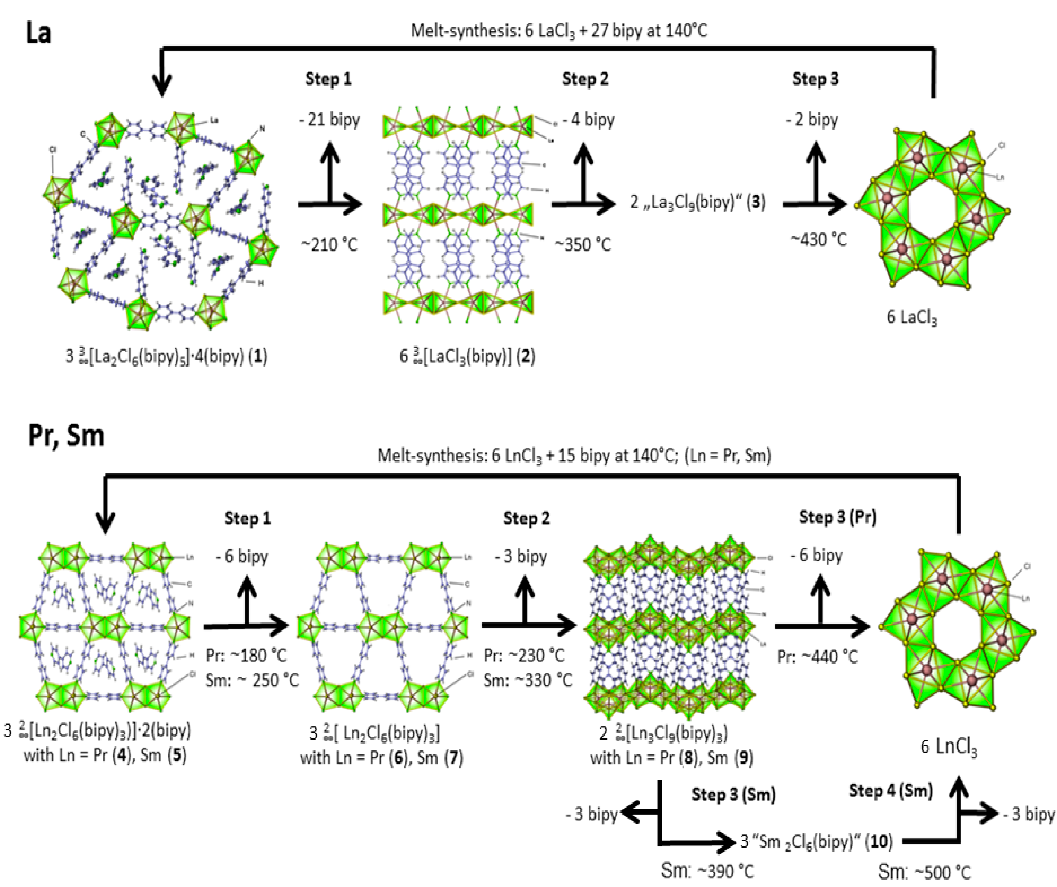 Depiction of the stepwise reaction and thermal condensation processes to new high temperature phases:[La2Cl6(bipy)5]·4bipy (1) via[LaCl3(bipy)] (2) and “La3Cl9(bipy)” (3) to LaCl3 (top);[Pr2Cl6(bipy)3]·2bipy (4) via[Pr2Cl6(bipy)3] (6) to[Pr3Cl9(bipy)3] (8) and PrCl3.[Sm2Cl6(bipy)3]·2bipy (5) via[Sm2Cl6(bipy)3] (7) to[Sm3Cl9(bipy)3] (9) followed by the yet structurally unidentified “Sm2Cl6(bipy)” (10) and SmCl3 (bottom); see also Supporting Information.