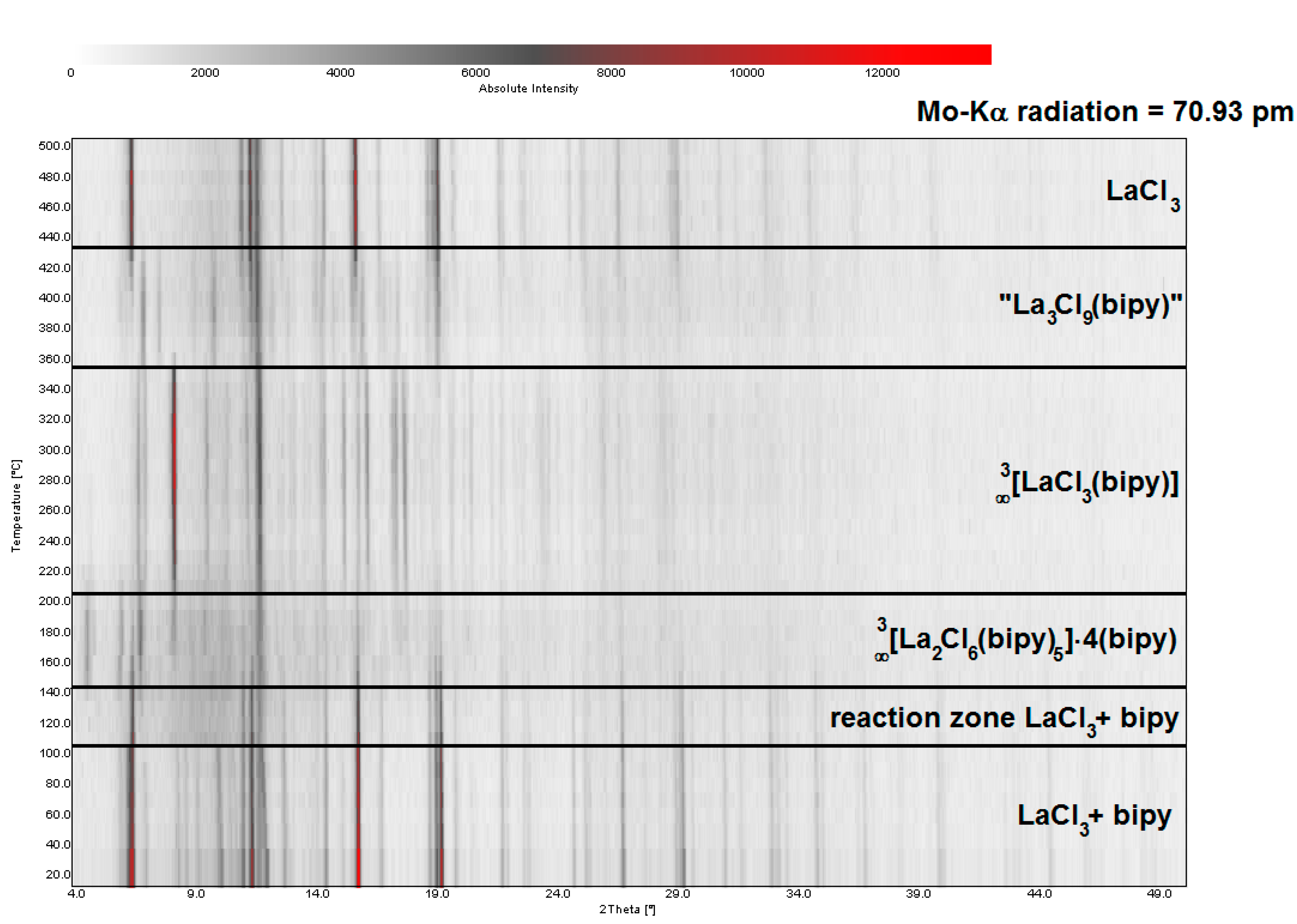 Depiction of temperature-dependent X-ray powder diffraction of the reaction of LaCl3 and 4,4′-bipyridine illustrating the temperature dependent formation of several crystalline coordination polymers and MOFs.