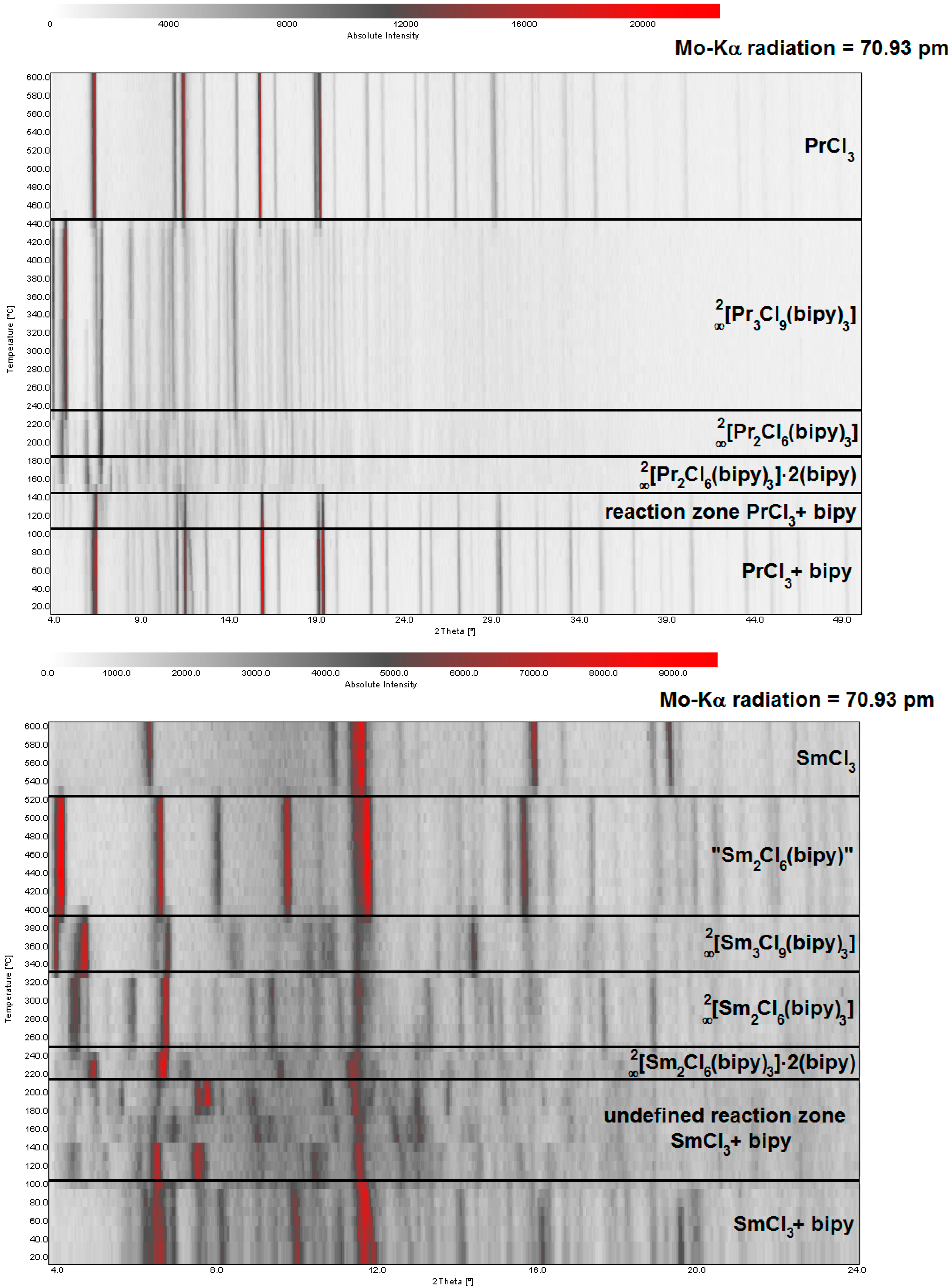 Temperature dependent XRPD investigation of the reaction between PrCl3 (top)/SmCl3 (bottom) and 4,4′-bipyridine, illustrating the temperature dependent formation conditions of several coordination polymers and MOFs and the reformation of crystalline LnCl3 salts.