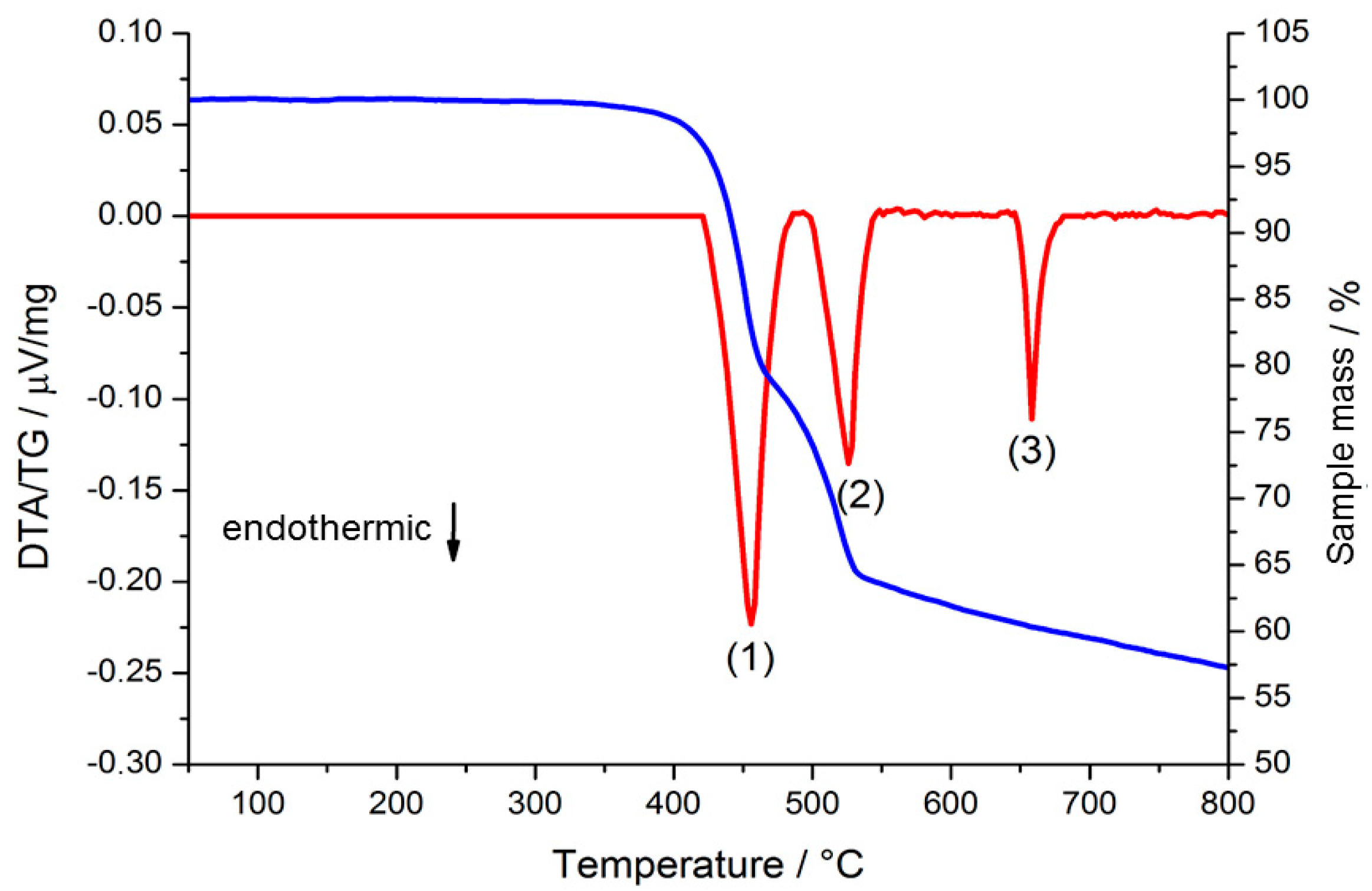 Simultaneous DTA/TG investigations on 8 and 9 corroborate these findings and reveal a mass loss of three (Pr; 34.5%, theor. 38.5%) or 1.5 equivalents (Sm; 20%, theor. 18.9%) of bipy molecules beginning at 350 °C (Pr) and 360 °C (Figure 7, signal 1 and Figure 3, bottom, step 3). Accordingly, the praseodymium and samarium containing reactions behave differently from this step on. The relevant temperatures of XRPD and DTA/TG investigations cannot fully match. Differences in the determined temperatures can be explained by the different analytic methods (closed system for temperature dependent XRPD; open system for DTA/TG investigations). For Sm another high temperature phase can be observed in the range from 390 to 530 °C in temperature dependent XRPD and in the range of 460 to 500 °C in DTA/TG analysis (Figure 7; between signals 1 to 2). A constitution of “Sm2Cl6(bipy)” (10) for the crystalline coordination polymer can be deduced from the mass loss of the TG, which corresponds to the remaining 1.5 equivalents of coordinated bipy (16%, theor. 18.9%) for 9 as starting point of the mass loss (Figure 7, signal 2 and Figure 3, bottom, step 4). For both lanthanides reformation of the crystalline LnCl3 salts is observed above 440 °C (Pr) and 530 °C (Sm) in temperature dependent XRPD. Thermal investigations reveal a starting point of the reformation at 350 °C (Pr) and 460 °C (Sm). Furthermore, the melting points of the corresponding LnCl3 could be observed: PrCl3 at 762 °C (mp. = 769 °C) [41]; SmCl3 at 651 °C (mp. = 677 °C) [42]. Analogous to the reaction with LaCl3 cyclic reactions of the reagents through the formation of highly aggregated frameworks and coordination polymers are also possible for samarium and praseodymium.
