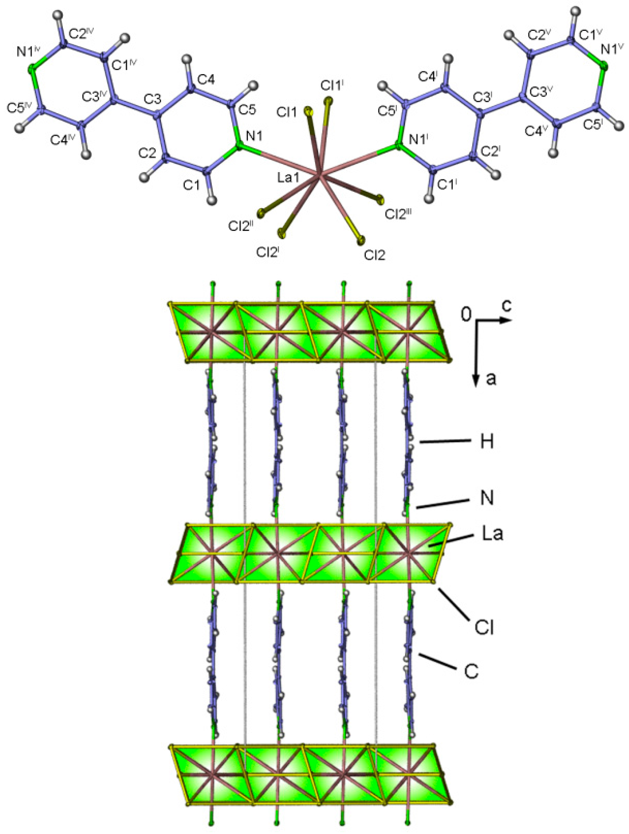 Coordination sphere with complete ligands of[LaCl3(bipy)] (2) different in two alternating positions of Cl2 within the trigonal-prismatic coordination sphere of the La3+ ion. Symmetry operations: I: 1−x, y, ½−z, II: 1−x, 1−y, −z; III: x, 1−y, ½+z; IV: 3/2−x, 2−y, z; V: x−1/2, 2−y, ½−z (top). View along the b-axis of the single-crystal structure of[LaCl3(bipy)] (bottom).
