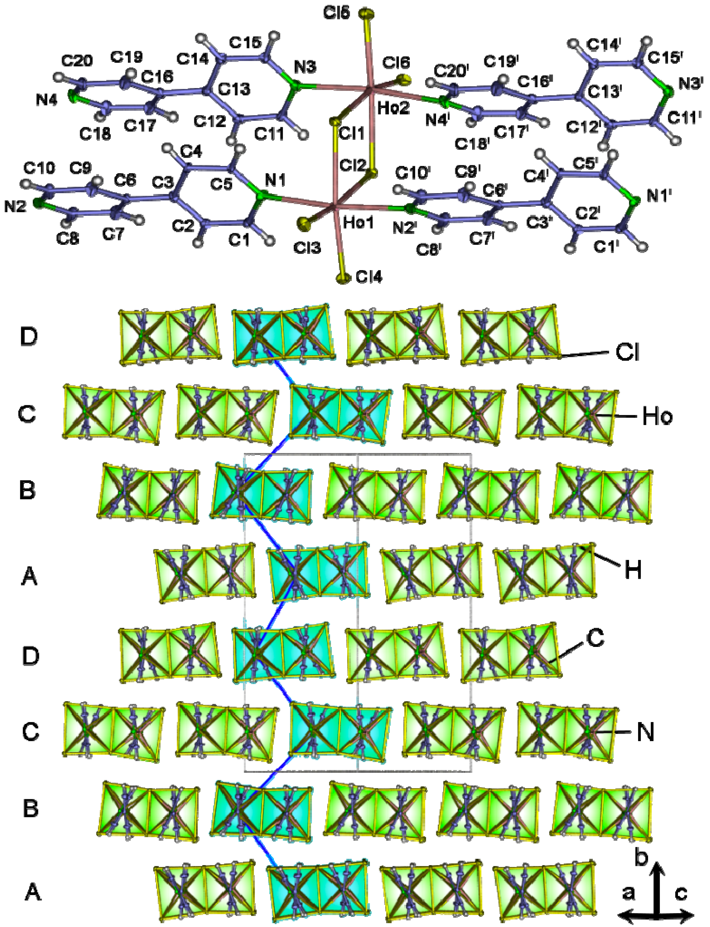 Extended coordination sphere with ligands of[Ho2Cl6(bipy)2] (11); thermal ellipsoids are depicted with 50% probability; symmetry operators: I 1+x, +y, −1+z (top). View along [101] parallel to the ladder like strands of[Ho2Cl6(bipy)2]; the stacking order is marked in blue (bottom).