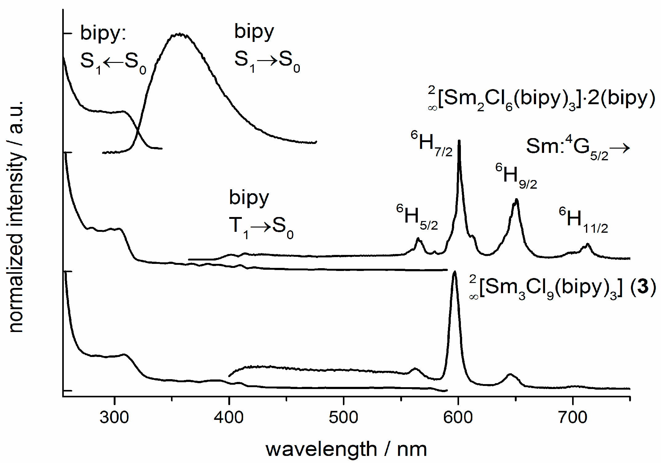 Photoluminescence investigation on the ligand bipy and the Sm-MOF[Sm2Cl6(bipy)3]·2(bipy) (5) and[Sm3Cl9(bipy)3] (9) in solid state at room temperature. Emission spectra were recorded at λexc = 300 nm, excitation spectra at the maximum of the referring emission.