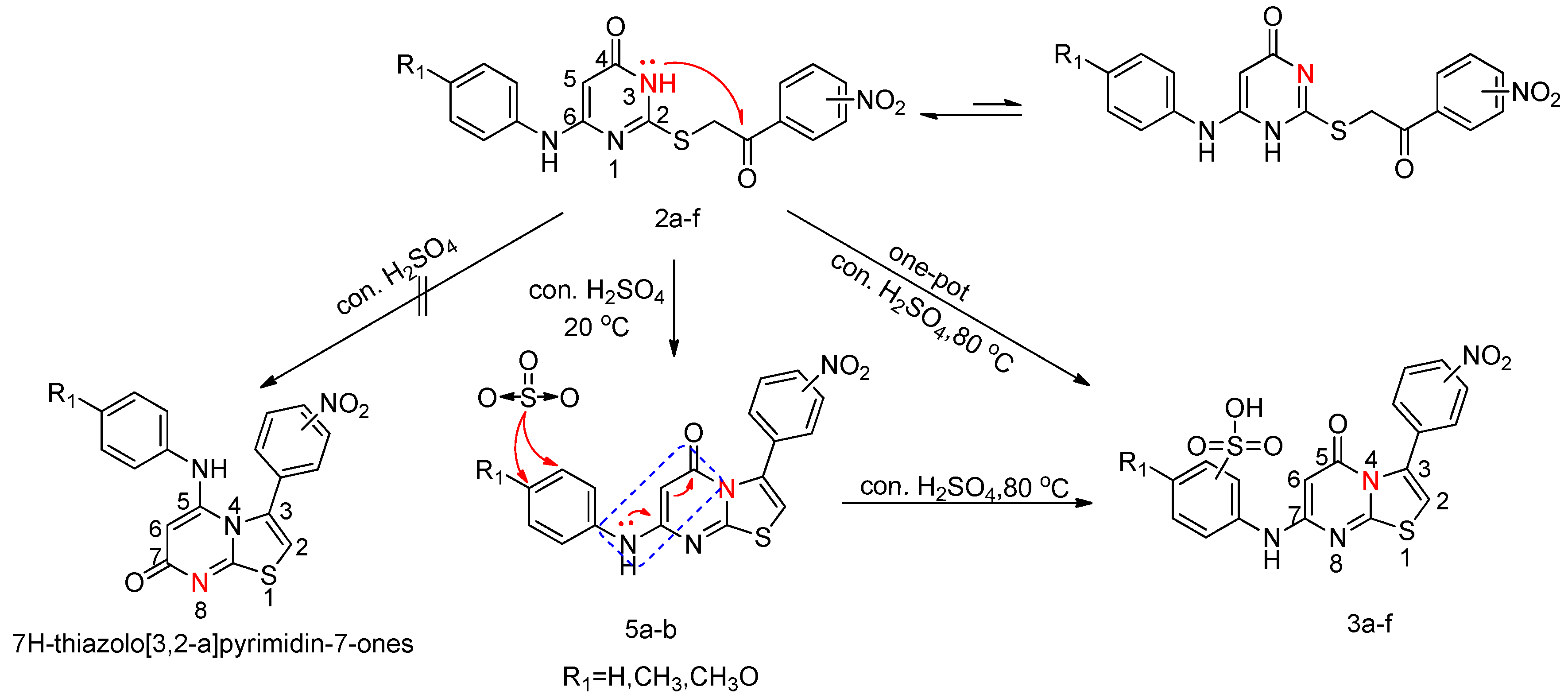Cyclization of S-alkylated derivatives 2a–f in concentrated H2SO4 represents an interesting case; mixtures of products (5H-thiazolo[3,2-a]pyrimidin-5-ones and sulfonic acid derivatives) were obtained which varied in relative amounts depending upon the reaction conditions (temperature and substituent groups).