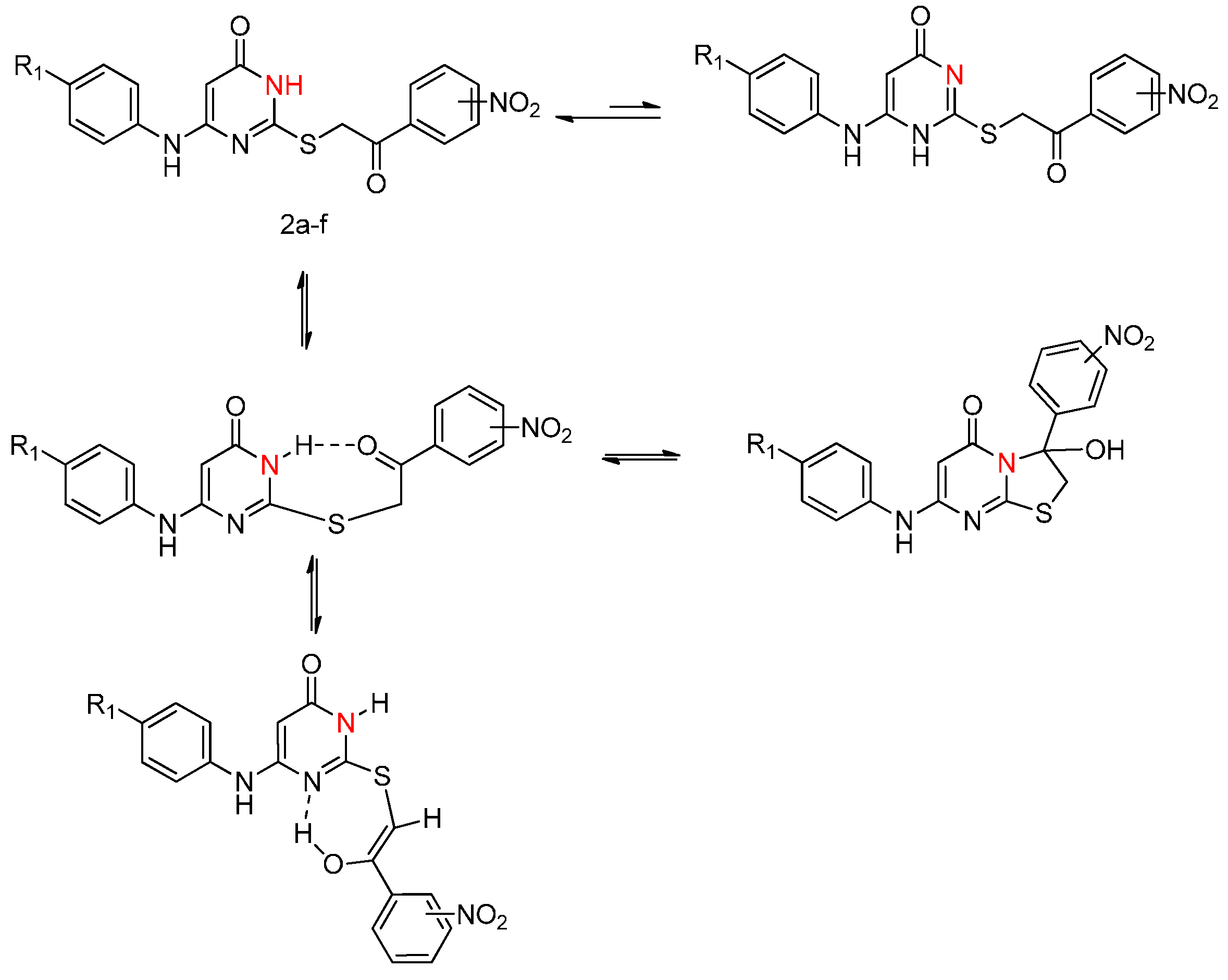 Inspection of the 400-MHz 1H-NMR spectra of the S-alkylated derivatives revealed an interesting phenomenon. The 1H-NMR spectrum (DMSO-d6) of compound 2a showed the characteristic singlet at δ 5.02 ppm for the methenyl protons and at δ 5.46 ppm for the 5-H proton of pyrimidine, the 3-nitrophenyl protons appeared between δ 8.59–8.61, 8.51–8.53, 7.33–7.35 ppm, the phenyl (anilino) protons between δ 7.42–7.45, 6.99–7.03, 6.83–6.86 ppm and the NH protons (at the pyrimidine C-6 atom) around δ 8.73 ppm. The signal was observed at δ 11.96 due to the N3-H proton. Moreover, the compound 2a seem to exist only partially in the cyclic form, The spectrum of compound 2a had a pair of doublets centered at δ 3.78 and 3.67 ppm comprising an AB system (J = 12.3 Hz) [12] and two singlets at δ 5.85, 5.24 ppm for OH, but an AB quartet did not fully account for two methylene protons. In most cases tautomerism in these compounds is clearly solvent-dependent [40].