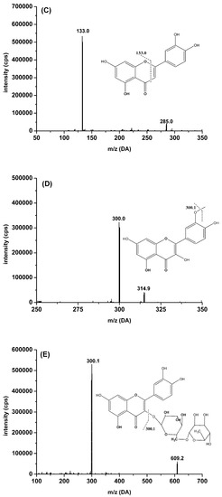Chemical structures and full scan product ion of precursor ions of cynaroside (A), quercetin (B), luteolin (C), isorhamnetin (D), rutin (E), formononetin (F) and baicalin (G; IS).