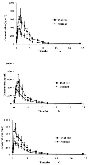 As shown in Figure 3 and Table 4, the results demonstrated that there were significant differences (p < 0.05) in pharmacokinetic parameters including AUC0–t, AUC0–∞, Cmax, Tmax, MRT, and CLZ/F between the two groups for the six analytes. A remarkable increase (p < 0.05) in the value of AUC0–t, AUC0–∞, Cmax and MRT in type 2 diabetic group was noted compared to the normal group. A longer Tmax was observed for the analytes in the type 2 diabetic group (p < 0.05), indicating a slower absorption of the analytes. In contrast, CL obviously decreased (p < 0.05) in the diabetic group. The results pointed out that the absorption of the six analytes was increased while the distribution and elimination processes were slowed down in the diabetic group compared to the normal group. The results might be attributed to pathological states of intestinal tract such as delayed gastric emptying and intestinal stasis [20], small intestinal hyperplasia and mucosal hypertrophy that may result in increased absorption of these analytes [21,22]. Type 2 diabetic mellitus can induce several complications such as nephropathy and liver disease [23], and may further affect the metabolism and CL of the analytes. This paper may be useful for deeper studies into the absorption process of Maydis stigma in vivo and beneficial for application in preclinical studies.