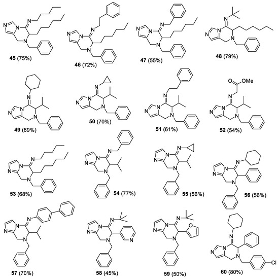 To our delight, all the attempted reactions consistently resulted in the formation of the desired imidazopyrazines (45–80), usually in excellent yields, without the formation of any by-products (Figure 4).