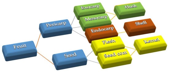 Undoubtedly, walnut fruit is the most crucial part of the plant for human because it contains the edible kernel. As has been shown in Figure 2, walnut fruit includes five individual parts which are known as kernel, skin, pellicle, shell, and husk. The inner part of the fruit contains the valuable kernel, and it is usually consumed in human nutrition. The kernel is enclosed by a leathery light brown thin layer which is known as skin or seed coat. The high concentration of antioxidants in this part of the fruit protects the kernel from different hazardous effects such as viral, fungal or microbial contaminations and also ultraviolet (UV) irradiation. The shell is the middle portion of walnut fruit that is considered as a hard lignocellulosic material. The kernel is surrounded by the shell which is known as a nut, and it must be mechanically cracked to release the kernel. Inside the nut, the kernel is divided into some parts by the pellicle. The outer part of the walnut fruit is its green husk, which cracks when the fruit on the tree is ready to be harvested and, thus, it can be easily removed [].