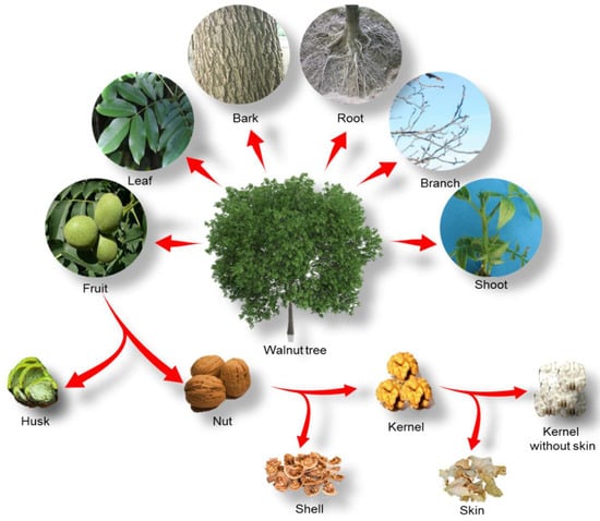 Moreover, other portions of the plant such as the leaf, bark, root, shoot, branch, and even the stem or root bark of walnut has also been studied in recent years (Figure 2). Today, the chemical constituents of these parts of the walnut tree were characterized in some research studies, and various potential uses in different fields have been defined.