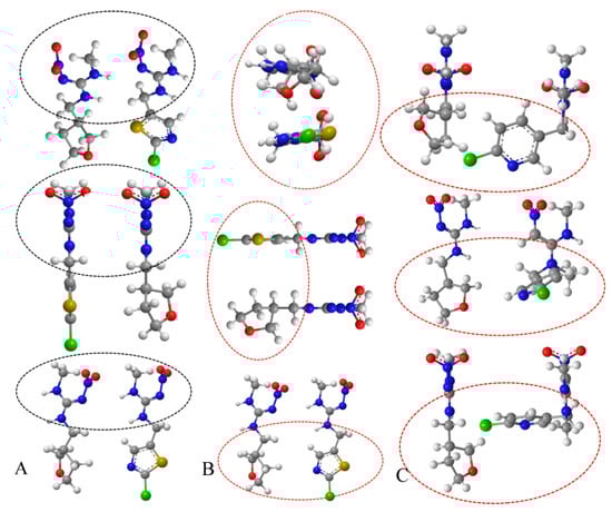 Spatial structures of analytes (The analyte with a green atom was clothianidin in column A and B, and correspondingly, it was nitenpyram in column C. The other molecular in each column is dinotefuran. The black and red circle in the figure manifested the same and different structure of the analytes, respectively.).