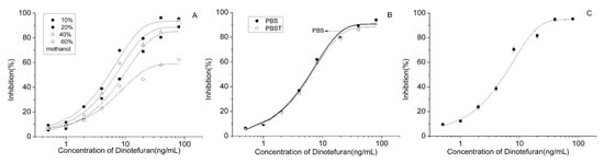 Inhibition curves of the antibody (A), optimization to the methanol proportion; (B) selection between PBS and PBST; and, (C) the optimized curve).