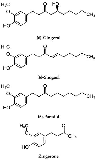 - Sang, S.; Hong, J.; Wu, H.; Liu, J.; Yang, C.S.; Pan, M.H.; Badmaev, V.; Ho, C.T. Increased Growth Inhibitory Effects on Human Cancer Cells and Anti-inflammatory Potency of Shogaols from Zingiber officinale Relative to Gingerols. J. Agric. Food Chem. 2009, 57, 10645–10650. [Google Scholar] [CrossRef]