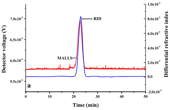 The molecular weight of CMI was determined while using gel permeation chromatography multi-angle laser light scattering (GPC-MALLS-RID). GPC chromatograms of CMI with a sharp peak are shown in Figure 4a. The value of dn/dc (mL/g) and polydispersity (Mw/Mn) of CMI were 0.13 and 1.11, respectively, which indicated that CMI was monodisperse [45,46]. When compared with GPC chromatograms of inulin in Figure 4b, the peak of CMI had shorter retention time, which suggested that the molecular of CMI was higher than inulin (2.70 × 103 ± 96 Da). This increment was attributed to the success of grafting of carboxy methyl groups in the inulin backbones [47,48]. The molecular weight of CMI was calculated as 3.93 × 103 ± 31 Da. Additionally, DS of CMI was determined to be 0.49 ± 0.0022 while using titration methods.