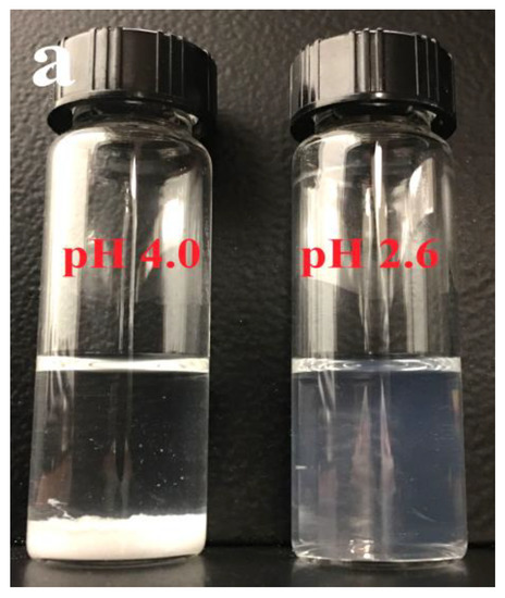 Dynamic light scattering (DLS), atom force microscopy (AFM), optical microscopy, and ζ-potential experiments were used to characterize the morphology of CMI/BSA complexes that formed in third region, since two kinds of specific CMI/BSA complexes existed with CMI/BSA ratio as 1:5, under pH values from pHφ1 to pHφ2. Two key pH values of 4.00 and 2.60 were chosen to compare the morphologies of the complexes. The main difference between pH-induced insoluble complexes (i.e., at pH 4.00) and soluble complexes (i.e., at pH 2.60) can be better illustrated in Figure 8a. At pH = 4.00, a clear global phase separation was observed (left image). However, at pH = 2.60, the complex solution was homogeneous and translucent (right image).