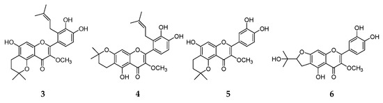 Prenylated flavonoids are characterized by the presence of lipophilic prenylated group on the parent skeleton. Their structure diversity is most attributed to the different position of prenylation, and various length, further cyclization and hydroxylation of prenyl chain. With diverse chemical structure, prenylated flavonoids exhibit extensive pharmacological actions, including antioxidant, anti-inflammatory, anticoagulant, antiviral, antimicrobial anticancer [22], antigenotoxic [23], antiplasmodial [24] and estrogen regulation activities [25]. However, currently, 80% of the approximately 1100 prenylated flavonoids exist in only three plant families (Asteraceae, Cannabinaceae, Leguminosae) [22]. Consequently, their exploitation and use is limited by the narrow distribution in the plant kingdom. Forty-six flavonoids, including 37 prenylated ones, were isolated from S. hexandrum [2,8,9,10,11]. Most of them were tested for the cytotoxic activity in tumor cell lines [2,9,11]. Further phytochemical studies on S. hexandrum resulted in the isolation of 16 new prenylated flavonoids and eight known analogues. Their cytotoxic activity was evaluated against MCF-7 and HepG2 cell lines. Compound 6 was the most valuable of all tested compounds. Further research is necessary to elucidate the antitumor mechanism. This study also enriches the chemical and pharmacological diversity of prenylated flavonoids.