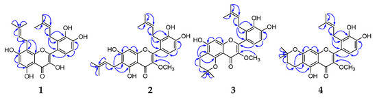 Compounds 3 and 4 were obtained as yellow, amorphous powders. Their HR-ESI-MS showed the same molecular formula of C26H28O7, according to an [M + H]+ quasi-molecular ion peak (m/z 453.1910 (calcd 453.1913) in 3; m/z 453.1912 (calcd 453.1913) in 4). Their 1H (Table 1, see Figures S9 and S13) and 13C-NMR (Table 2, see Figures S10 and S14) spectra were similar to each other, and closely correlated with those of 2, differing by the presence of one 2,2-dimethyldihydropyrano group instead of one 3-methyl-2-butenyl in 2. One 2,2-dimethyldihydropyrano group was based on a series of signals consisting of two methylene groups (δ 2.54 (2H, t, J = 6.8 Hz), 1.74 (2H, t, J = 6.8 Hz), δ 16.7, 30.8 in 3; δ 2.62 (2H, t, J = 6.7 Hz), 1.81 (2H, t, J = 6.7 Hz), δ 15.7, 30.9 in 4), two tertiary-methyl groups (δ 1.30 (6H, s), δ 26.4 (×2) in 3; δ 1.30 (6H, s), δ 26.3 (×2) in 4), and one oxygen-bearing aliphatic quaternary carbon (δ 74.7 in 3; δ76.2 in 4). The methylene group (δ 2.54 (2H, t, J = 6.8 Hz, H-1″) in 3; δ 2.62 (2H, t, J = 6.7 Hz, H-1″) in 4) showed the long range correlations (Figure 2) with C-5 (δ 154.6 in 3; δ 158.2 in 4), C-6 (δ 105.0 in 3; δ 104.4 in 4), and C-7 (δ 159.8 in 3; δ 159.8 in 4), indicating that the 2,2-dimethyldihydropyrano group was attached to C-6 and C-7, or C-5 and C-6. The presence of the phenolic hydroxyl group (δ 10.60 (1H, s, 7-OH) in 3; δ 13.00 (1H, s, 5-OH) in 4) supported the linking position of the 2,2-dimethyldihydropyrano group (C-5 and C-6 in 3; C-6 and C-7 in 4). Thus, the structures of compounds 3 and 4 were deduced respectively as 5,6-(2,2-dimethyldihydropyrano)-2′-(3-methyl-2-butenyl)-7,3′,4′-trihydroxy-3-methoxyflavone (3) and 6,7-(2,2-dimethyldihydropyrano)-2′-(3-methyl-2-butenyl)-5,3′,4′-trihydroxy-3-methoxyflavone (4), and named sinoflavonoids R and S.
