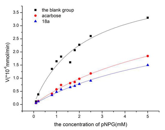 The Ki for compound 18a was 0.110 mM, which was calculated according to the data in Table 2. The Ki for acarbose was 0.113 mM. The results showed that compound 18a was the most potent α-glucosidase inhibitor and therefore may be useful for treating type Ⅱ diabetes.