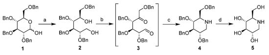 1-DNJ synthesis. Reagents and conditions: (a) LiAlH4, THF, 0 °C; (b) (COCl)2, DMSO, DCM; (c) NaBH3CN, CH3COONH4, Na2SO4, MeOH; and (d) H2, Pd/C, r.t.