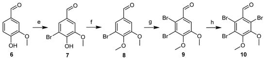 The synthetic routes to the intermediate products 6–10 are shown in Scheme 2. First, commercially available vanillin 6 was reacted with bromine in CH3OH at 0 °C to produce compound 7 with a 95% yield. Compound 7 was methylated with CH3I in DMF to provide compound 8 with a 97% yield. Then, a second bromination of compound 8 was performed using double the amount of equivalent bromine in acetic acid at 60 °C, yielding compound 9 (60% yield). This compound was further brominated with N-bromosuccinimide (NBS) in concentrated sulfuric acid to generate compound 10 (48% yield) [,].