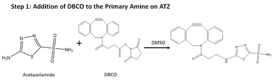 - Synthesis of the targeting ligand: Acetazolamide is the ligand bound on the BSA particle. The amide group of the acetazolamide is first activated to a primary amine group. This activated amine is conjugated to DBCO that has the functional group for click chemistry.