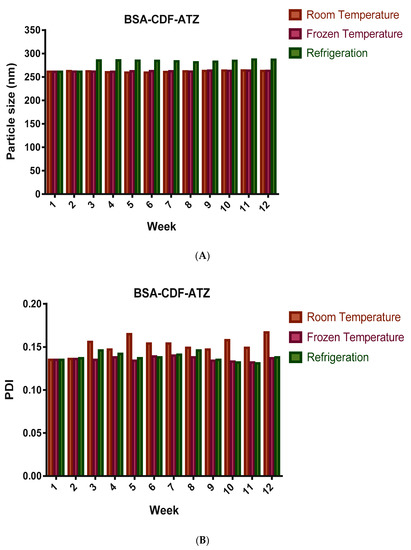 The stability of the formulation over the shelf life period was evaluated in terms of particle size, PDI, and drug loss at three distinct conditions, i.e., at room temperature (25 °C), refrigeration (4 °C), and freezing conditions (−20 °C) for 3 months [12,36]. The samples were extracted each week and investigated for the said parameters.