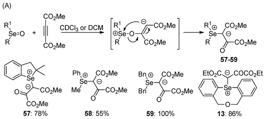 Condensation of stable selenoxides with activated methylene compounds promoted by the addition of dicyclohexylcarbodiimide (DCC) was employed by Magdesieva and coworkers for the preparation of selenonium ylides 56a–c with a trifluoroacetyl group attached to the ylidic carbon atom (Scheme 15) [55].