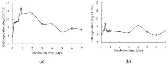 In this experiment, glucose and yeast extract were used as a control for carbon and nitrogen sources, respectively [3]. Moreover, the composition of commercially available selective MRS medium was used as a reference to formulate growth medium comprising various renewable natural polymers. Figure 1a–g show the cell population of L. plantarum RI 11 grown in different medium formulations collected at different incubation times, whereby different renewable natural polymers that affected the growth of L. plantarum RI 11 substantially attributed to different nutrients were provided by different renewable natural polymers [1,2,3]. The initial cell population of approximately log 8 CFU/mL was observed for all formulated media as shown in Figure 1a–g.
