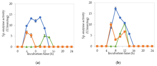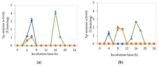 Figure 7a–c show the specific endoglucanase, exoglucanase and β-glucosidase activities which were detected at pH 5, 6.5 and 8, respectively, when L. plantarum R1 11 was grown in basal medium supplemented with PKC and yeast extract (M5). For this formulation, one isozyme of endoglucanase was present at pH 6.5 and 8 respectively with significantly lowest (p < 0.05) activities of 1–2.7 µg/min/mg detected. As for exoglucanase activity, although it was detected from pH 5–8, an insignificant (p > 0.05) level of activity was recorded. Interestingly, significant specific activities of β-glucosidase were detected between 4–8 h of incubation, having 7.55 µg/min/mg at pH 8 as the highest activity. Surprisingly, no mannanase was detected from M5 medium. This finding was in contrast with the study reported by Kim et al. [72], whereby PKC that comprised of mannan polysaccharides did not induce the mannanase production in this study. Nevertheless, the results of this experiment were in close agreement with the finding of El-Sharouny et al. [73], whereby the production of mannanase was induced by the presence of simple sugars such as glucose.