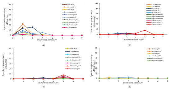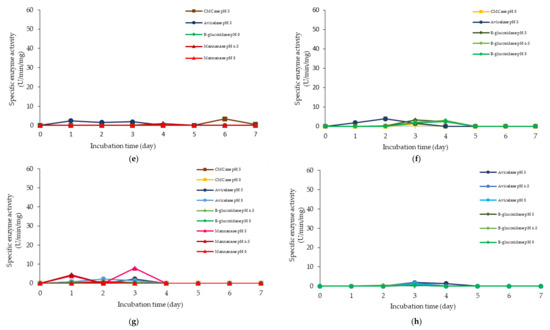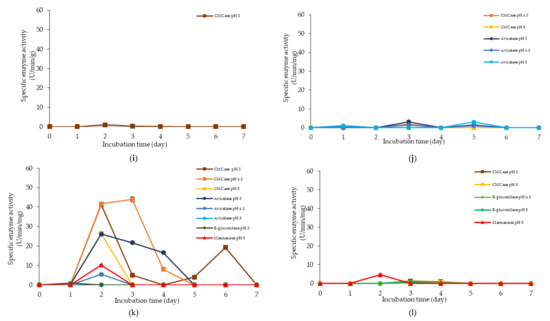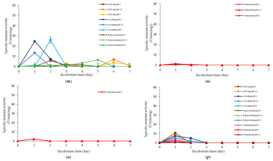 Specific extracellular cellulolytic and hemicellulolytic activities of Lactobacillus plantarum RI 11 grown in (a) F2; (b) F3; (c) F4; (d) F5; (e) F6; (f) F7; (g) F8; (h) F9; (i) F10; (j) F11; (k) F12; (l) F13; (m) F14; (n) F15; (o) F16; (p) MRS; (q) CRMRS during seven days of incubation. The enzyme activities were detected at three different pH levels. The error bars represent the standard deviation of specific enzyme activity of triplicate samples (n = 3). The medium composition was listed in Table 4.