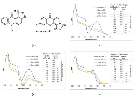 (a) Typical metal (M) chelation sites in 1,2-dihydroxy- (1, a) and 3,4-dihydroxyxanthones (2–3, b); (b) UV/Vis spectra of compound 1 in methanolic solution with sequential additions of FeCl3; (c) UV/Vis spectra of compound 1 in methanolic solution with sequential additions of CuCl2; (d) UV/Vis spectra of compound 2 in methanolic solution with sequential additions of FeCl3; (e) UV/Vis spectra of compound 2 in methanolic solution with the sequential addition of CuCl2; (f) UV/Vis spectra of compound 3 in methanolic solution with sequential additions of FeCl3; (g) UV/Vis spectra of compound 3 in methanolic solution with the sequential addition of CuCl2.