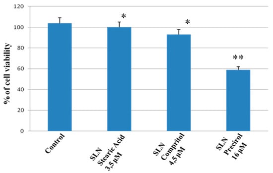 Percentage of viability of primary human Dental Pulp Stem Cell (DPSC) cell cultures exposed to stearic acid (3.5 µM), Compritol (4.5 µM) 888 ATO, and Precirol (16 µM) 5 ATO for 24 h. Results are expressed as the mean ± S.D. of the values of five separated experiments performed in triplicate. ** indicate p < 0.05 significant differences vs. control, and * represents p > 0.05 vs. control (untreated cells).