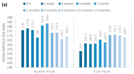 Stability of PEGylated nanoparticles was monitored for six months during storage at room temperature (Figure 3). In terms of stability, blank and CUR-pSLNs showed a good stability; in fact, no significant variation of mean size, homogeneity, and zeta potential values was observed in the DLS measurements after six months of storage at room temperature.