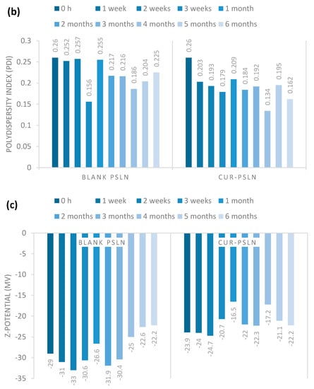 (a) Particle size, (b) polydispersity index (PDI), and (c) Z-potential of blank pSLNs and CUR-pSLNs during storage at room temperature for 6 months.