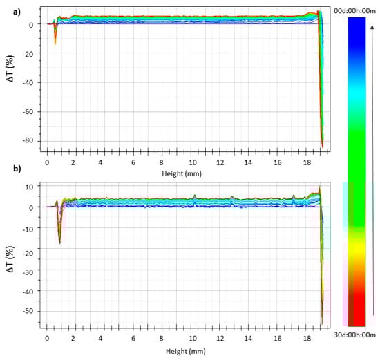 Turbiscan® ΔT profiles of blank (a) and CUR (b) pSLNs stored for 30 days at 25 °C.