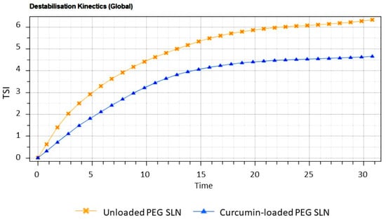 Blank and CUR-pSLNs were stored at 25 °C for 30 days in Turbiscan® station to evaluate the occurrence of physical instability phenomena: the occurrence of important variation in ΔT signal at the bottom or the top of the spectra indicates particles migration phenomena (clarification, sedimentation, or creaming), while variations in the middle are related to particle size changes. The transmission profile of blank and CUR-pSLNs are reported in Figure 4. The linearity of the transmission profiles (ΔT < 10%) clearly demonstrates the great physical stability during storage, without the occurrence of particles aggregation or migration at the top or at the bottom of the cuvette. The great physical stability could be related to the zeta potential values of the samples (around −30 mV). Destabilization kinetics reported as Turbiscan® Stability Index (TSI) units (Figure 5) clearly showed that both samples were highly stable, since they did not show significant modification of the TSI value until 30 days of storage. However, based on the TSI global results, we could infer that CUR loading slightly increases the physical stability of the colloidal dispersion.