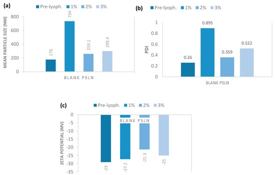 (a) Mean particle size (Z-Ave), (b) polydispersity index (PDI), and (c) zeta potential of blank pSLNs using increasing concentrations of glucose.