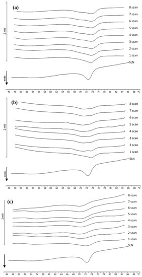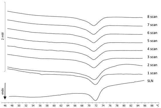 Blank SLNs were put in the calorimetric pan, and PEG micelles were added at different molar ratios. The samples were immediately submitted to calorimetric analysis (Figure 9). It was clearly evident that PEG affects the SLNs’ calorimetric curve in different ways, depending on the molar ratio. In Figure 8, the calorimetric curve of blank SLNs are compared with the calorimetric curves of SLNs put in contact with PEG micelles at different incubation times (scan) (to save space, only the most representative calorimetric curves corresponding to 1:0.1, 1:0.5, and 1:1 molar ratios are shown). SLNs show a main peak at about 72.5 °C. At a 1:0.1 SLN/PEG molar ratio, the main peak is still present; however, a shoulder at about 69 °C is also visible. At a 1:0.25 molar ratio, the main peak decreases, and the shoulder increases. These results indicate that PEG interacts with the SLN and localizes on the outer layer of the SLN; in particular, the stearoyl moieties of the DSPE could be inserted on the SLN; whereas the PEG moiety could protrude on the SLN surface. The presence of two peaks at some amount of PEG micelles indicates that in the outer layer of the SLN, two different regions coexist: PEG-rich regions and PEG-poor regions. In particular, the signal at lower temperature is related to the PEG-rich regions, whereas the signal at higher temperature is related to the PEG-poor regions. On increasing the amount of PEG micelles, we observed that the peak at higher temperature decreased in favor of the peak at lower temperature and hence, in the SLN outer layer, the PEG poor regions decreased, whereas the PEG rich regions increased. At a 1:1 molar ratio, the presence of a single peak at the lower temperature suggests that PEG could be homogeneously present in the SLN outer layer; this could promote the CUR release in the case of CUR-SLNs.