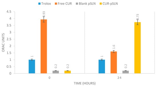The results reported in Figure 10 pointed out the effect of encapsulation on CUR antioxidant activity. In particular, at 0 h, free CUR showed a remarkable antioxidant activity with respect to encapsulated CUR. After 24 h of monitoring, free CUR antioxidant activity decreased, while the activity of CUR encapsulated in pSLNs significantly increased. These results confirm the evidence reported in the literature regarding the key role of SLN encapsulation in preserving the antioxidant capacity of active antioxidant compounds for a longer time, with a mechanism probably related to the preservation of the compound stability [].