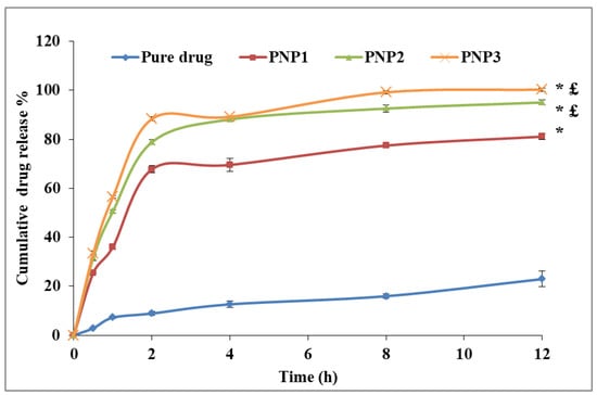 The cumulative in vitro release of DOXY from the different formulas. Data for the cumulative release were measured over 12 h and presented as mean ± SD. Statistical analysis for the last data point was done using one-way ANOVA followed by Bonferroni’s post-hoc test at probability value < 0.05, * Compared to the free drug, £ Compared to PNP1.