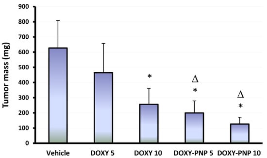 The mass of the solid tumors in the experimental groups. Column chart demonstrates the mean value of tumors for each mouse ± SD. Data were analyzed using multivariate ANOVA followed by Bonferroni’s post-hoc test at probability value < 0.05. * Versus vehicle and Δ versus DOXY 5 mg/kg, n = 6.