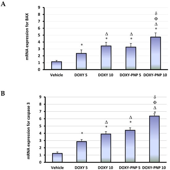The tumoral mRNA expression for BAX and caspase 3. Column chart demonstrates the mean value of BAX (A) and caspase 3 (B) expression for each mouse ± SD. Data were analyzed using multivariate ANOVA followed by Bonferroni’s post-hoc test at probability value < 0.05. * Versus vehicle and Δ versus DOXY 5 mg/kg, Φ versus DOXY 10 mg/kg, δ versus DOXY-PNP 5 mg/kg, n = 6.