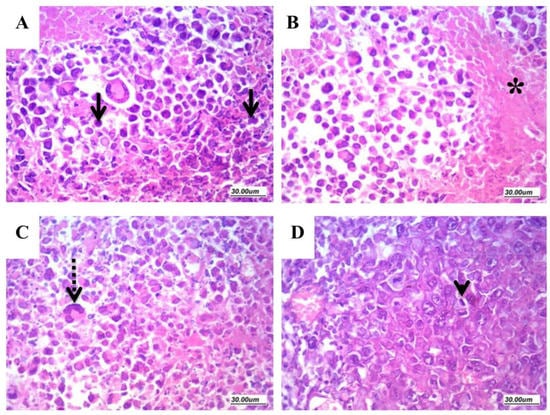 Histopathologic features of solid Ehrlich carcinomas. Sections from the solid tumors stained with H&E (×400) showing: (A) apoptosis (arrows); (B) necrosis (star); (C) giant cells (dashed arrow); and (D) mitosis (arrow head).