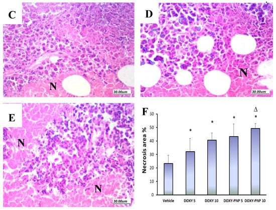 Extent of tumor necrosis in solid Ehrlich tumors. Sections from the solid tumors stained with H&E (×100) showing (A) the vehicle group with minimal necrosis within viable tumor tissue, compared to wide areas of tumor necrosis in the groups treated by either free DOXY (5 and 10 mg/kg) (B,C) or DOXY-PNP (5 and 10 mg/kg) (D,E); N—refers to necrosis area. (F) Column chart demonstrating the mean necrotic area ± SD. Data were analyzed using multivariate ANOVA followed by Bonferroni’s post-hoc test at probability value < 0.05. * Versus vehicle, Δ versus DOXY 5 mg/kg, Φ versus DOXY 10 mg/kg, δ versus DOXY-PNP 5 mg/kg, n = 6.