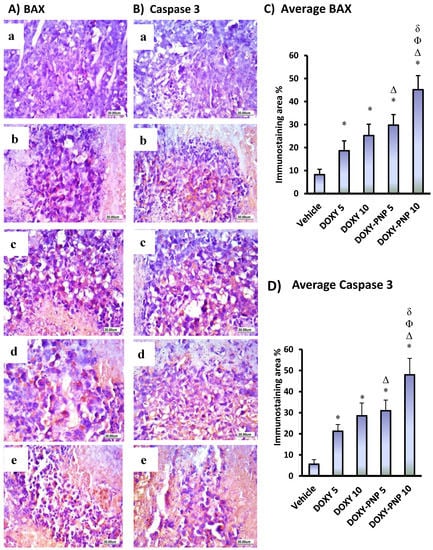 Immunohistochemical staining for BAX and caspase 3 in solid tumors. (A) Images for tumor specimens stained for BAX protein in different groups (a—vehicle; b—DOXY 5; c—DOXY; d—DOXY-PNPs 5; e—DOXY-PNPs 10), (B) images for tumor specimens stained for caspase 3 in different groups (a–e), (C,D) column charts demonstrating the mean area of staining ± SD for BAX and caspase 3. Data were analyzed using multivariate ANOVA followed by Bonferroni’s post-hoc test at probability value < 0.05. * Versus vehicle, Δ versus DOXY 5 mg/kg, Φ versus DOXY 10 mg/kg, δ versus DOXY-PNP 5 mg/kg, n = 6.