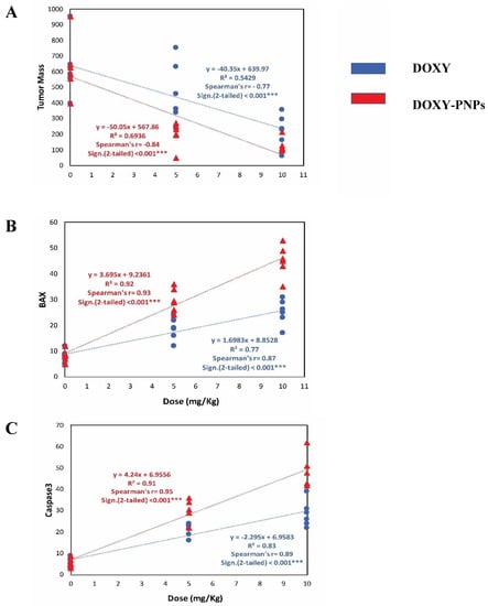 The current data were evaluated by simple linear regression of tumor mass in relation to the dose of DOXY and DOXY-PNPs (Figure 9). Linear regression analysis and trend-line indicated that free DOXY and DOXY-PNPs strongly and significantly decreased tumor masses (r = −0.77, and r = −0.84, respectively). However, DOXY-PNPs strongly decreased tumor masses than free DOXY (Figure 9A). BAX was strongly elevated with increased doses of free DOXY (r = 0.87) and DOXY-PNPs (r = 0.93) as revealed by Spearman’s correlation and simple linear regression (Figure 9B). Immunohistochemistry of caspase 3 was greater with increasing doses of DOXY (r = 0.89) and DOXY-PNPs (r = 0.95) as revealed by Spearman’s correlation and simple linear regression (Figure 9C).