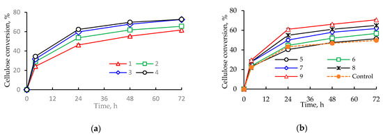 Another positive effect of addition of saponins was the reduction in the enzyme dosage required for achieving similar cellulose conversion. For instance, in the experiments with 5% solids load, a 6 g/100 g RQS dosage combined with 7.5 FPU/g cellulase loading (run 3) gave a conversion comparable with that achieved by using 4 g/100 g saponins and 10 FPU/g (run 7) (Figure 2a). Similarly, at 10% solids, both 2 and 6 g/100 g RQS addition combined with the lowest cellulase loading (5 FPU/g) (reactions 5 and 6) resulted in better conversion than that achieved with a 50% higher cellulase dosage and no saponin (Control) (Figure 2b). This is in good agreement with previous reports showing that in the enzymatic hydrolysis of furfural production residues, the addition of Gleditsia saponin alleviated the negative effect on cellulose conversion caused by increased substrate loading [21].