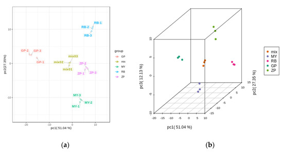 PCA score plots and correlation diagram between samples (RB, ZP, MY, GP) and quality control (QC) samples (mix). (a) PCA score plots; (b) PCA 3D score plots. Every point represents an independent biological replicate. (c) Correlation diagram between samples. The abscissa represents the sample name, the ordinate represents the corresponding sample name, and the color represents the value of the correlation coefficient.